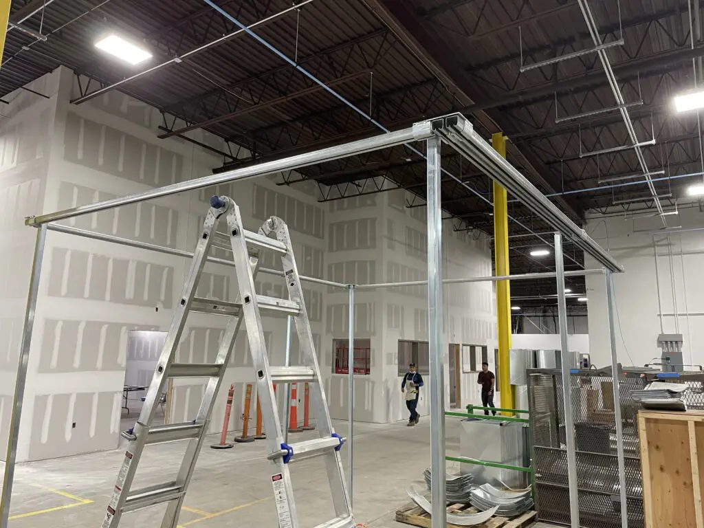 The enclosure we designed to reduce air hammer noise was 8′ x 10′ x 8′. This size enclosure provided ample room for the planned air hammering that Duc-Pac had in store. Using a double track system, we were able to include a sliding curtain for access to the interior of the enclosure. We also built in clear view vinyl noise barrier to allow some light and viewing into the enclosure.