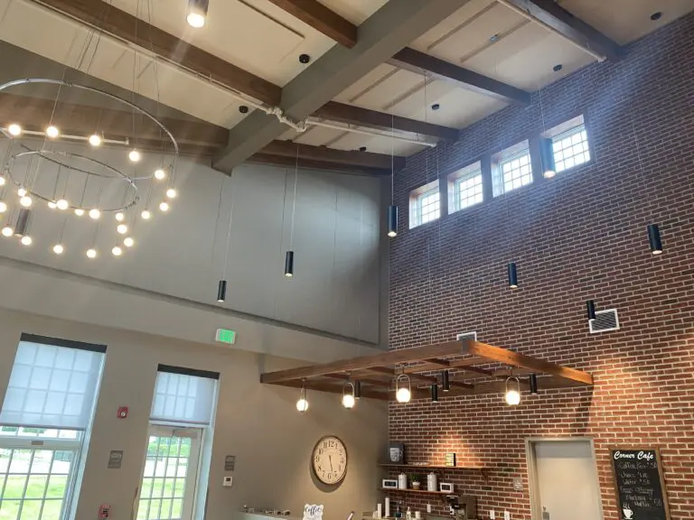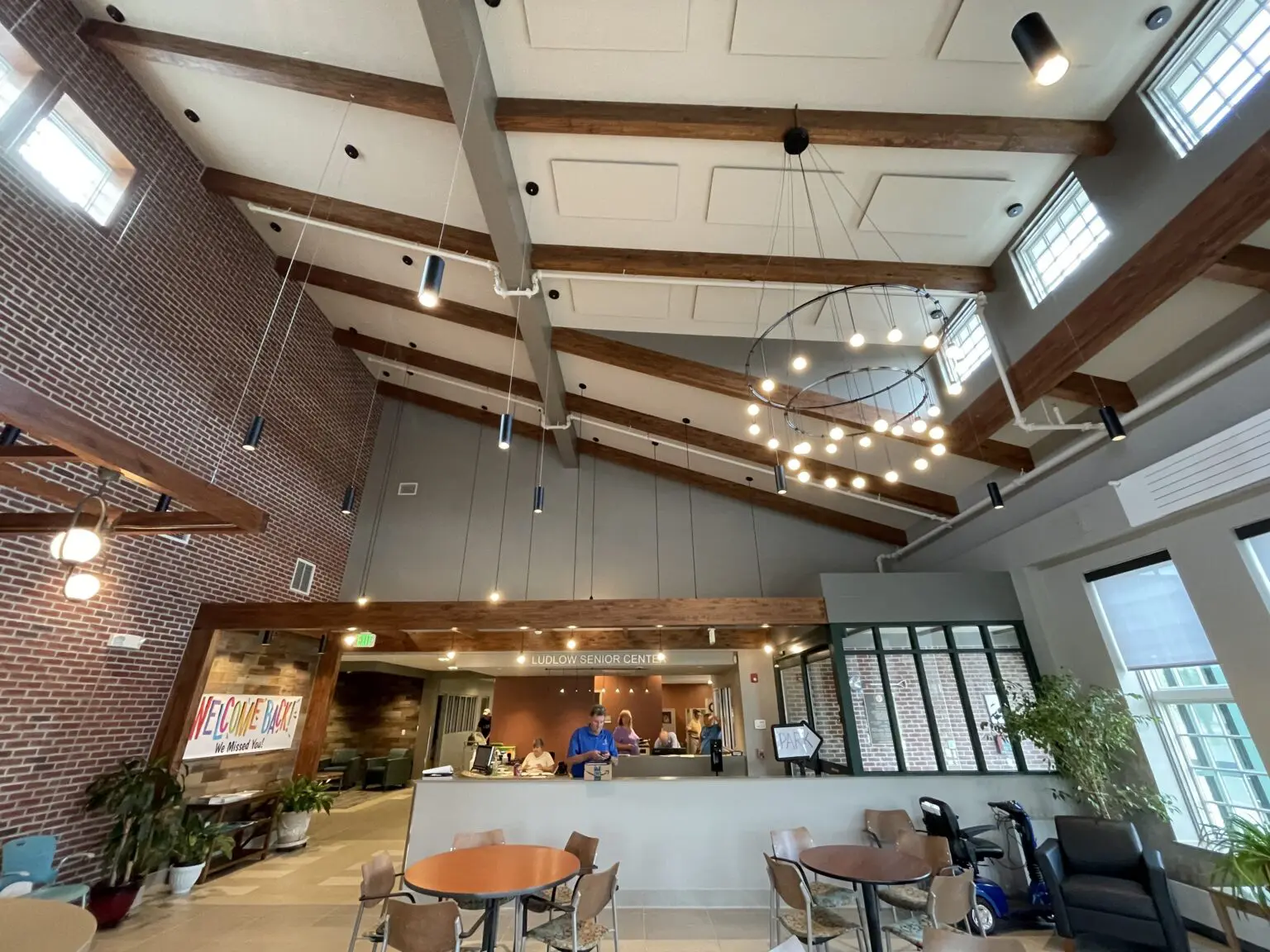 The lobby is a space where members meet to have their morning coffee and mingle. They catch up with friends while waiting for lunch and other activities. The lobby has a high peeked ceiling with lots of reflective surfaces. One wall of the space is entirely brick. The Senior Center loved the look of the brick. We needed to come up with a solution without covering the brick wall.
