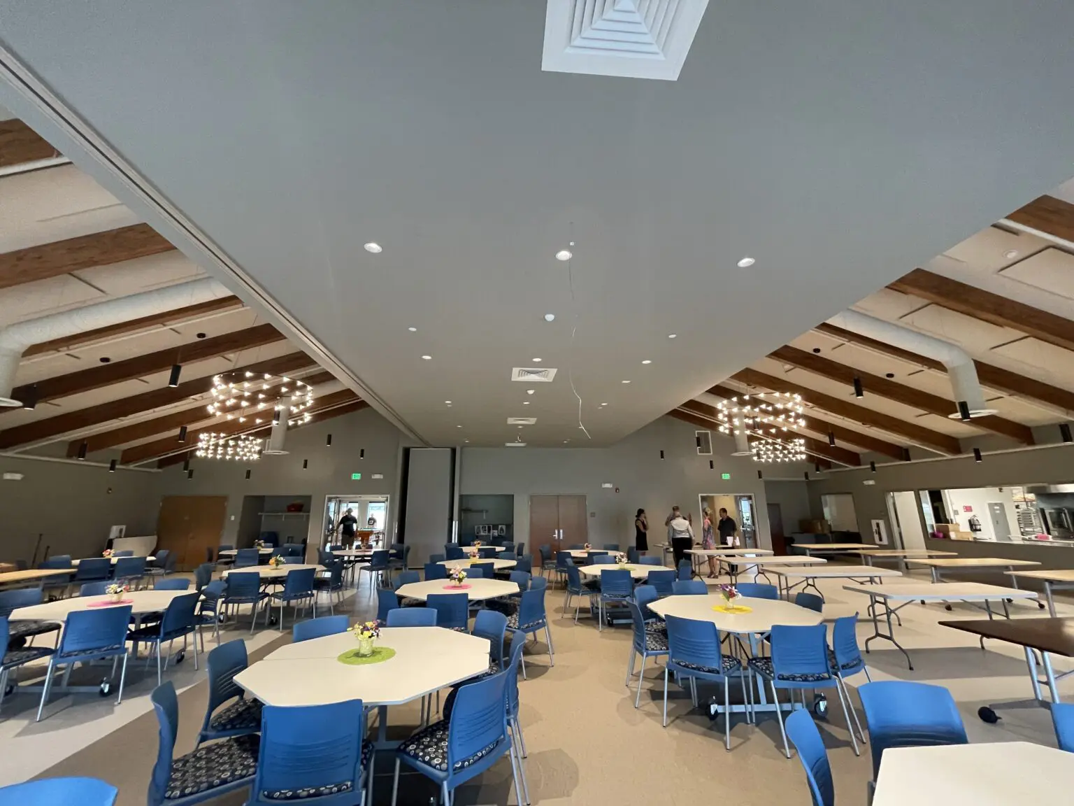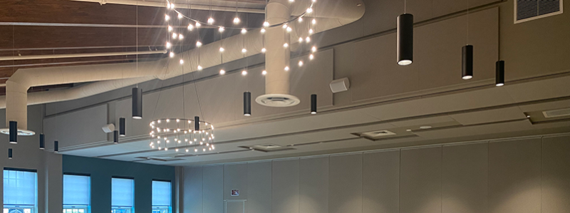 The second space of concern was their large dining room. A space that hosts up to 150 members for daily, homestyle lunch. This was another space with a tall ceiling and highly reflective surfaces such as tile, glass, and drywall. Over a hundred members talking simultaneously over lunch make for lots of reverberation and noise-buildup. The center wanted people to have an easier time listening.