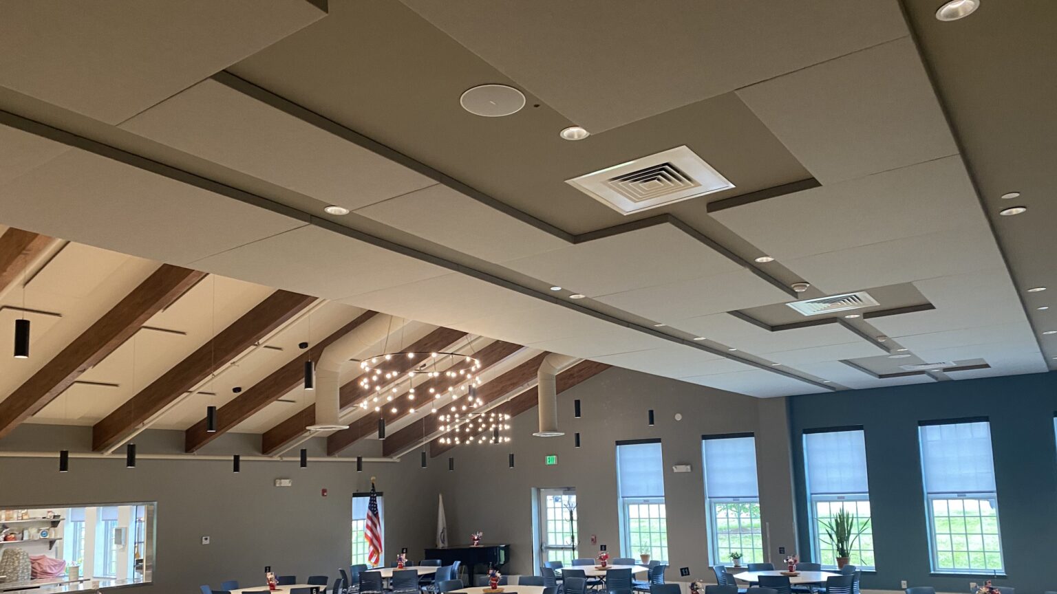 A beautiful, new Senior Center in Ludlow, MA was developed and opened in 2021. The center featured state of the art technology and increased access to space and resources for aging adults. However, they noticed an issue with echo and noise in their dinning room and lobby. Looking for a solution, they turned to DDS Acoustical Specialties, where we proposed custom, fabric wrapped panels.